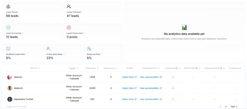 | Trigger | The action that brought the lead in (new follower / new like) |
