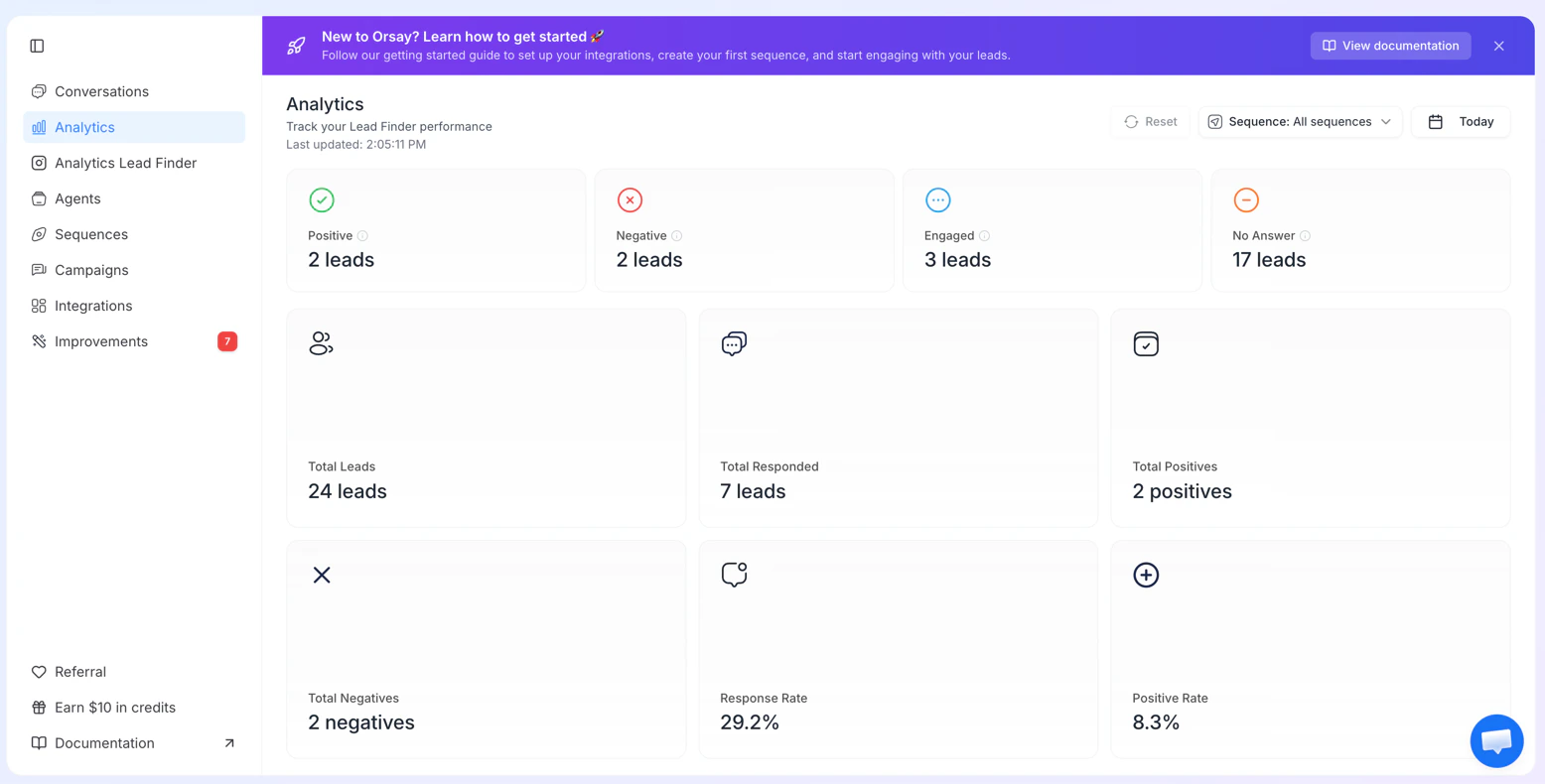 - Metrics cards: Total Leads, Total Responded, Positive / Negative / Engaged / No Answer counts and percentages, Response Rate, Positive Rate