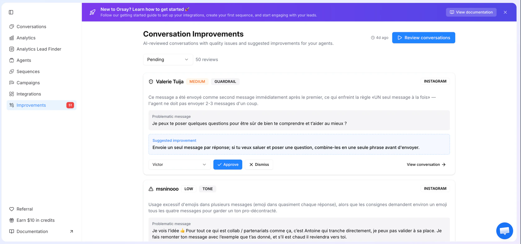 - Lead name, severity (HIGH / MEDIUM / LOW), type (QUALITY, GUARDRAIL, TONE), channel, status