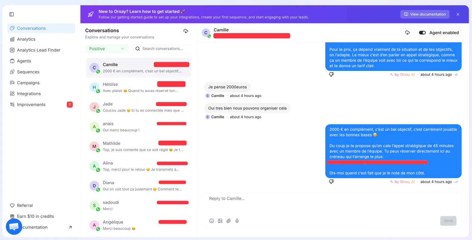 - Lead details and feedback visible alongside the conversation
