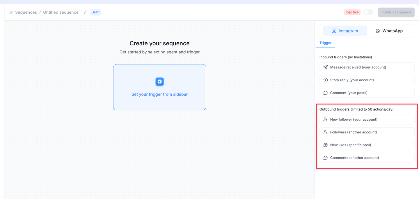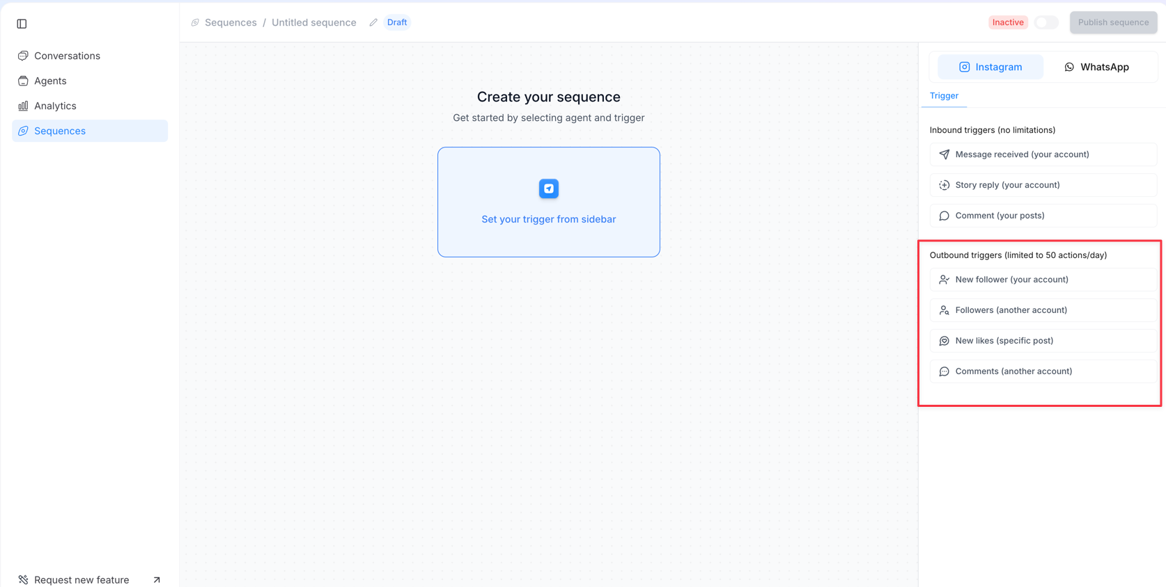 ✅ Message received (your account) 📝 Story reply (your account) When a reply is made to an Instagram story, this action is triggered 💬 Comment (your posts) When a comment is made on an Instagram post, this action is triggeredIf you need help configuring your AI agent, Orsay’s support team is here for you! Reach out to us on WhatsApp for quick and personalized assistance.