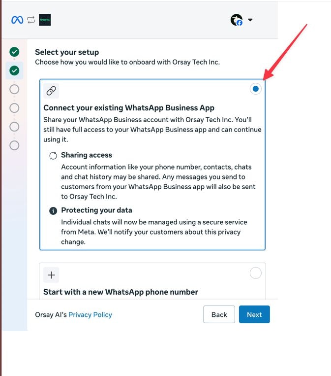 - Select “Connect with existing WhatsApp Business App”