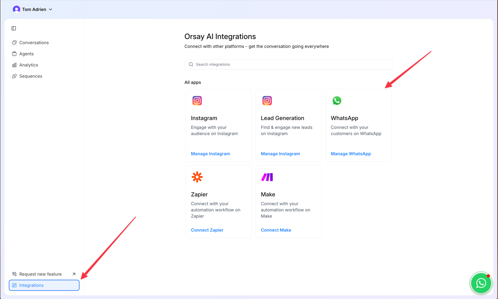 - Go to Integration → WhatsApp
