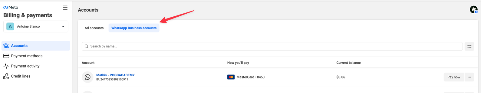 - Go to https://business.facebook.com/billing_hub → Select the right business you have just added a phone number to → go to WhatsApp and add a payment method to it.