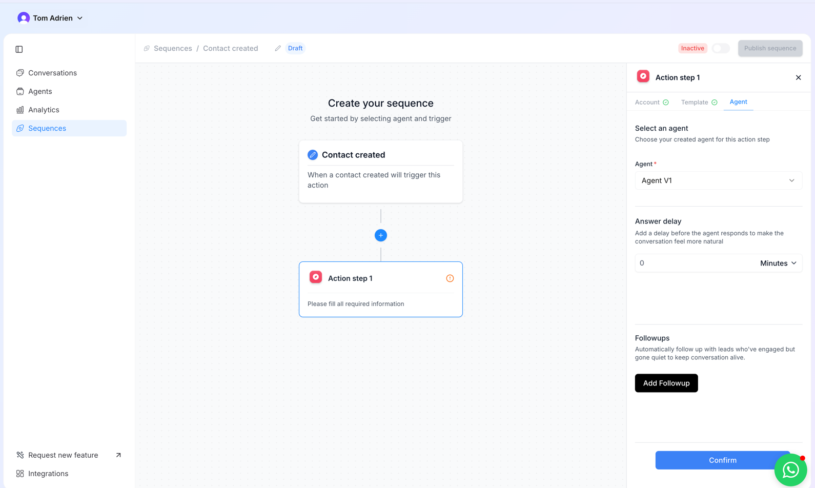 - Select the Agent, Response Delay, and add follow-ups if needed, then click ‘Confirm’.