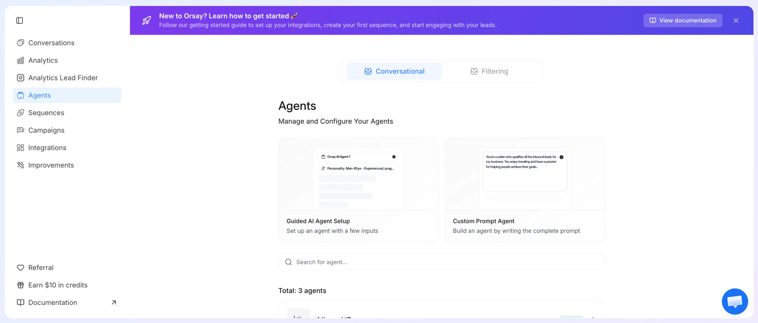 - Conversationnel — Liste des agents IA actifs. Chacun peut etre modifie, configure ou supprime. Les agents gerent et repondent aux leads.