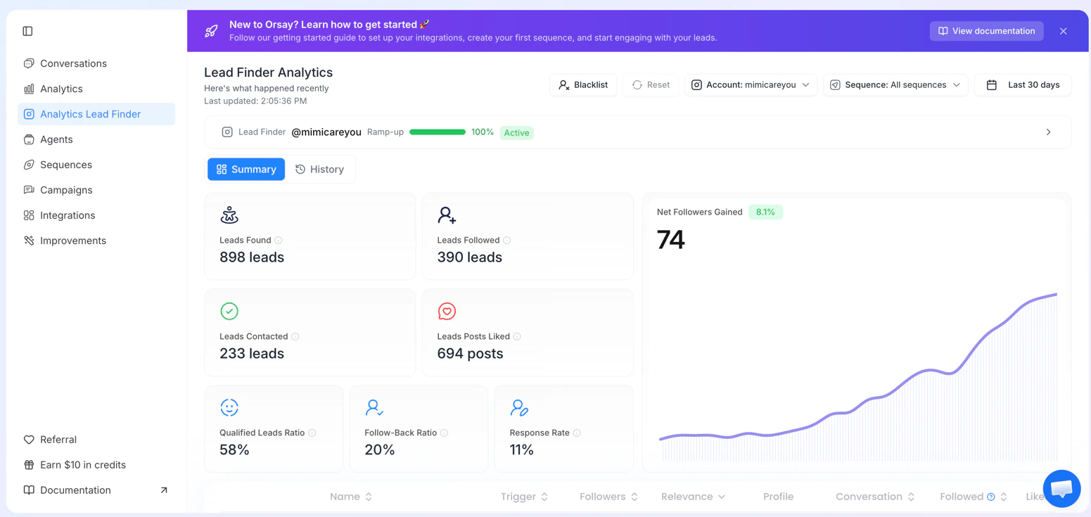 - Selecteur de compte Instagram — basculez entre les comptes Lead Finder connectes